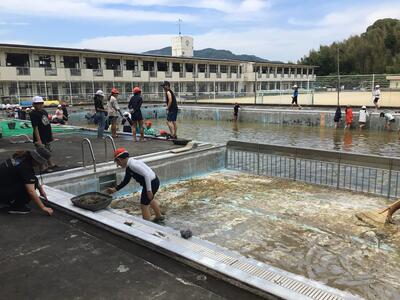 4年生以上の子どもたちが、落ち葉まみれのプールサイドや、汚れて、濁った水のプールを、一生懸命きれいに磨いてくれました。おかげで、みんなで使うプールが見ちがえるようにきれいになりました!