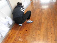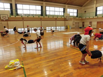 今日は、柔軟体操や手押し車、マット運動をしました。