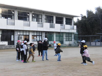 2年担任の花田先生と6年生の女の子たちが、長縄で遊んでいるのです。