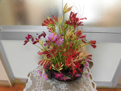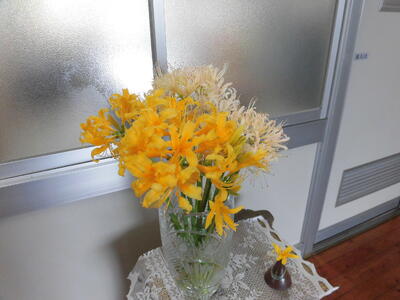 校長室前には、輝くように鮮やかな黄色と白の彼岸花を飾っていただいています。