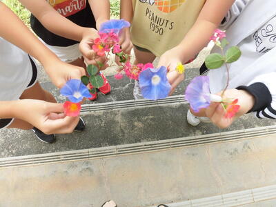 理科の授業のために校庭の花を摘んでいた女の子たち。