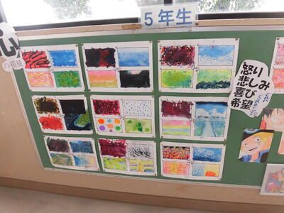 5年生の図工で、色や線のイメージで感情を表す取組をしました。
