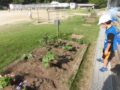 2年生は、一人一鉢のミニトマト、それからナスビにピーマン!