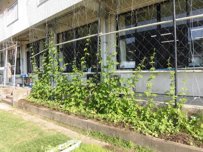 ゴーヤのグリーンカーテンも、ずいぶん伸びてきました。