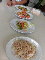 6月最後の給食のメニューは、「チーズパン ポークビーンズ あじナゲット 海藻サラダ」です。