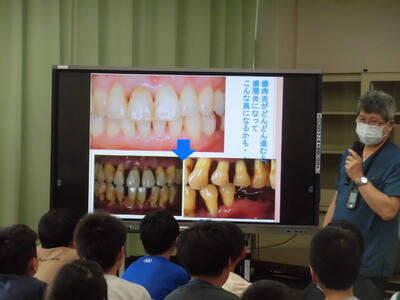 学校歯科医の山本先生と歯科衛生士の荒木さん、浦部さんに、歯磨き指導に来ていただきました。