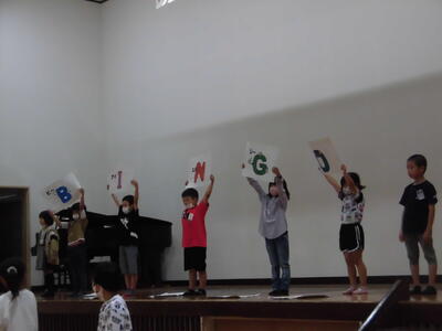 始めに、2年生の「子犬のビンゴ」の歌と踊りの発表です。