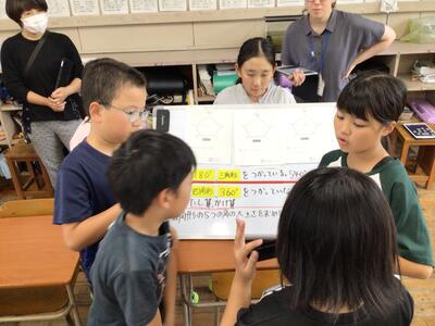 算数『図形の角』五角形の内角の和の求め方について考えを深めました。