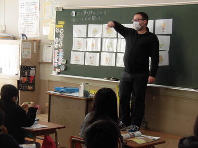 今日は、ALTのアラン先生が外国語の授業をしてくださる日です。