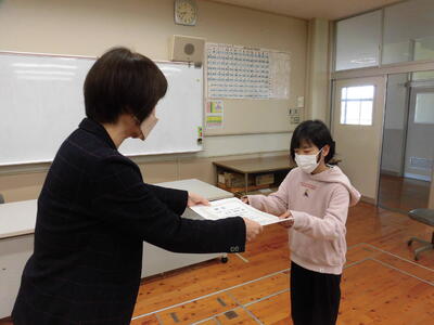 環境委員会の子供たちが、エコキャップをたくさん届けてくださった古島さんと北野さんに感謝状を書いてくれました。