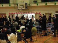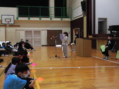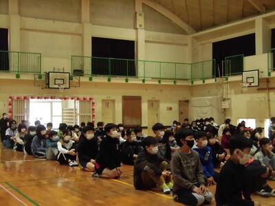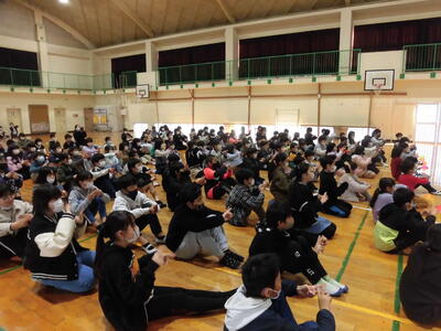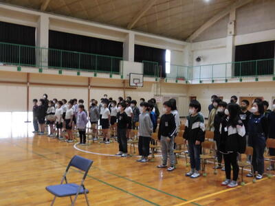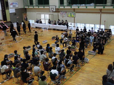 それから体育館で、子供たちとのお別れの会「退任式」をしました。
