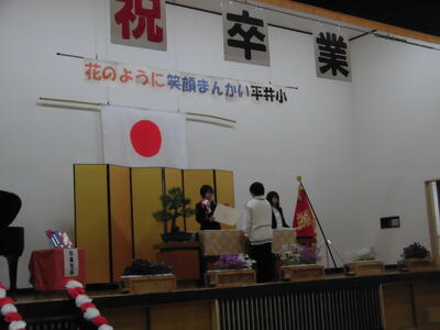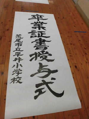 卒業式に向けて、平井小学校運営協議会副会長の山本さんに看板用の表示を書いていただきました。