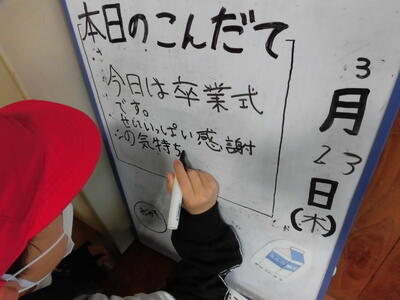 毎朝書いてくれる献立のお知らせを、今日も5年生の給食委員さんが記入してくれていました。