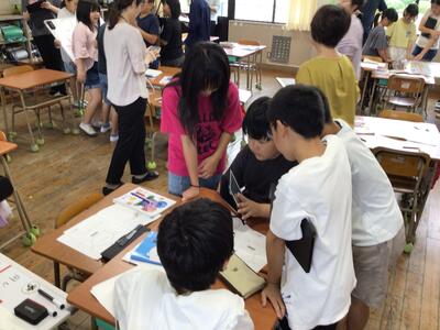 聞き取ったり、タブレットで撮影したりしたものを、自分たちのグループに持ち帰り、報告します。