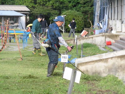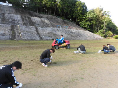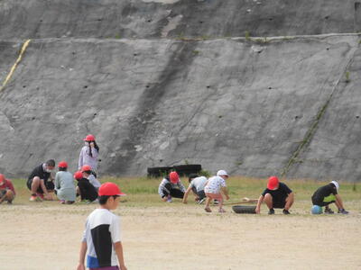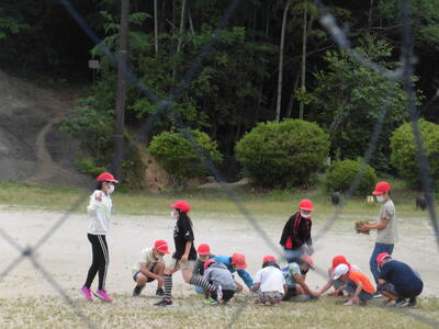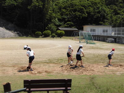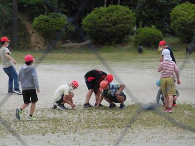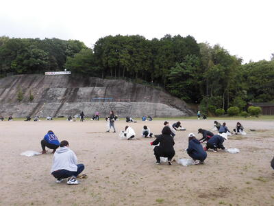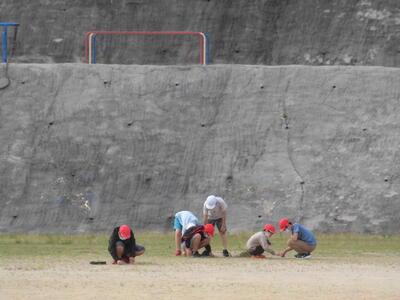 今朝の運動場。草取りをする5年生の姿が増えていました。