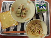 今日のメニューは、「きのこスパゲティ」「ビーンズサラダ」「にんじんパン」です。