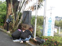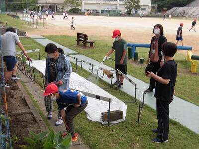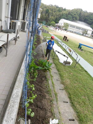 職員室前の花壇には、今年もゴーヤを植え、グリーンカーテンをつくります。