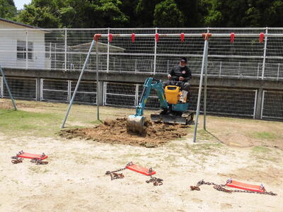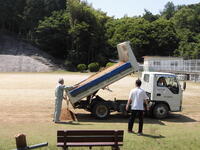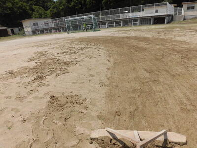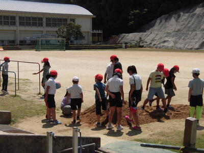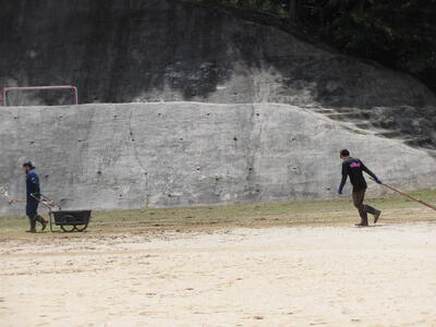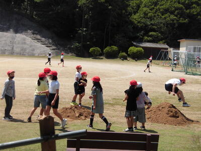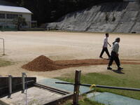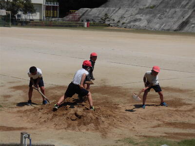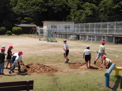 遊びながら広げられていた砂山は、掃除時間に4年生のお友達によって、さらに範囲が拡大されました。