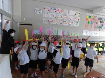 1年生は、ダンスで使う旗を持って、ゴキゲンです!