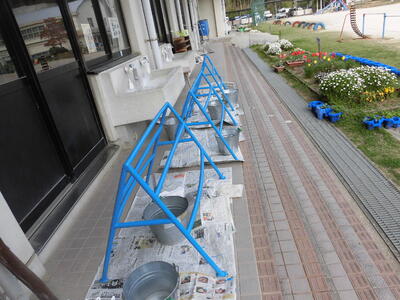 助丸の古嶋さんが、「雑巾の物干しを塗ってあげるよ」と、来てくださいました。