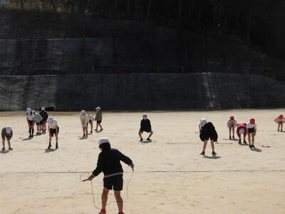 体育館での体育が多かった6年生が、運動場で縄跳びをしています。