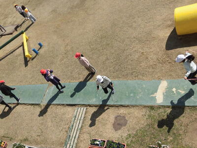 「つるつるするから、気をつけてね」と言いながら運動場を歩きます。