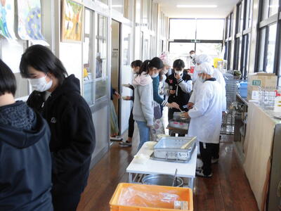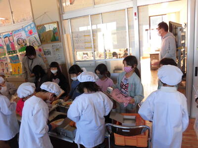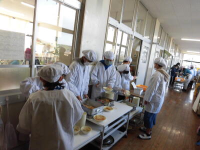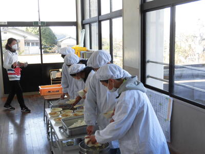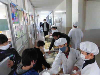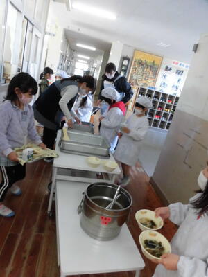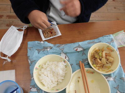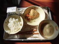 今日の給食は、「武光公汁」「肉しのだ」「じゃこと野菜の和え物」に、ご飯と牛乳でした。