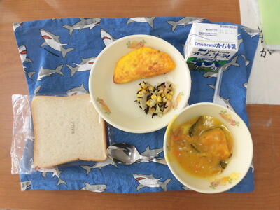「かぼちゃのクリーム煮」「オムレツ」「ひじきマリネサラダ」に食パン、牛乳です。
