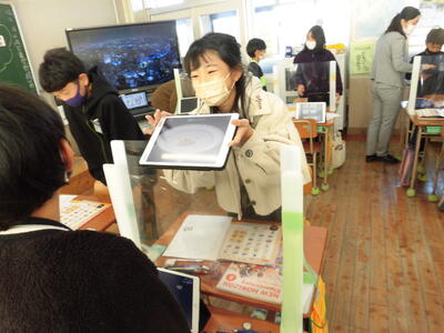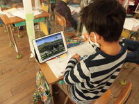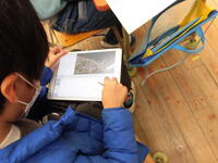 2年生が、タブレットを手に手に、運動場を走り回っていました。