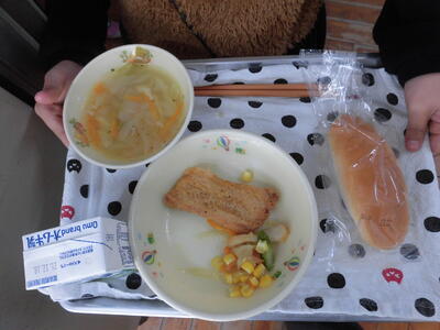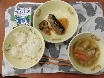 今日の給食は、「のっぺ汁」「いわしかぼすレモン煮」「ごま昆布あえ」にご飯と牛乳でした。