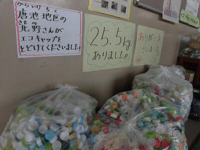 唐池の北野さんが持ってきてくださったエコキャップについて、環境委員会が、お知らせする掲示をしてくれています。