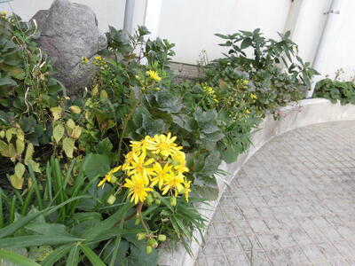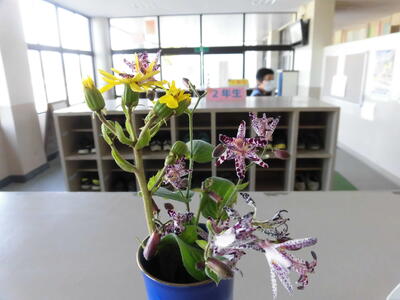 草花の名前を知らない無骨を嘆いていたら、図書室の齋藤先生から「黄色がツワブキで、紫と白のがホトトギスですよ」と教えていただきました。