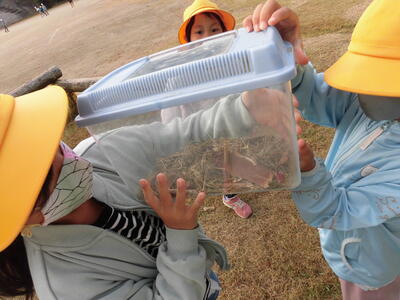 虫籠をぶら下げた男の子に、「虫取りに行くの?」と尋ねると、「お散歩に連れて行くの」と答えました。