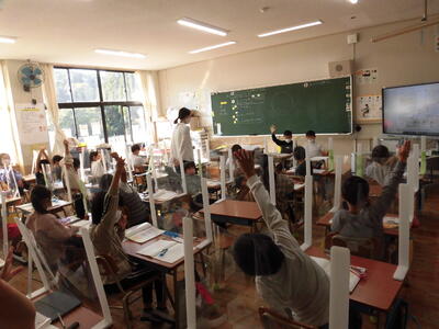 体育委員会、放送委員会、環境委員会の子供たちが、オンラインで全校児童に呼びかけました。