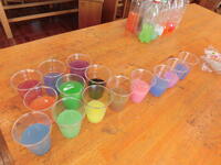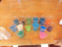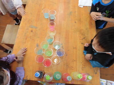 1年生は、色水をつくって遊んでいました。