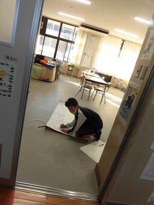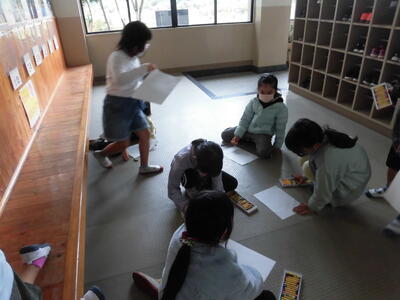 1年生は、床や壁をこすって、作品をつくっていました。