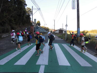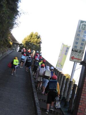 秋らしい雲の下、子供たちは今日も元気に登校です。