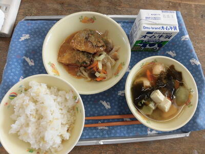 もちまるごはん、お野菜つみれ汁、サバごま味噌煮、野菜炒め、それに牛乳です。