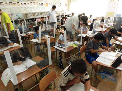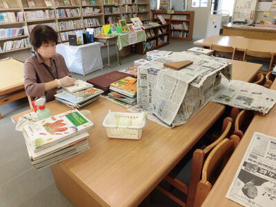 図書室では、返却された本を数日間貸し出し禁止にし、消毒して本棚に戻しています。