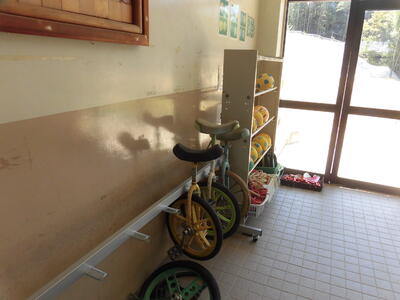 壊れたまま倉庫に眠っていた一輪車を発見し、用務員の菰田さんに修理していただいたので、置き場からあふれていたのです。