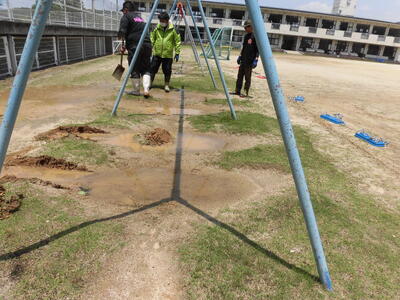 PTA美化作業~こんなことまで!~ 投稿日時 : 2022/05/16 学校サイト管理者 5月14日(土) 美化作業の疲れがピークの時でしたが、ブランコの周辺の整地をしていただきました。 水たまりが解消され、安全に楽しく遊べます。 神様に見えました! ありがとうございました!!
