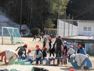 子供たちは、縄跳びやシーソーで楽しそうに遊んでいます。