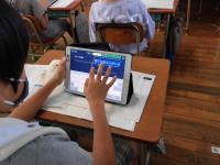 2年生は、野菜の生長の様子をタブレットを使って記録しているところです。
