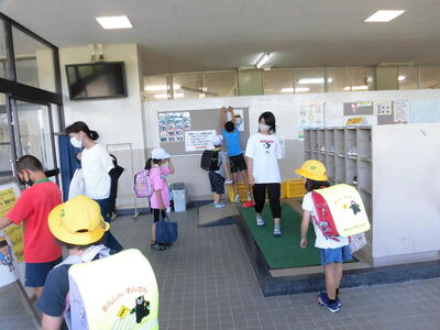 昇降口では、総務委員会の子供たちが、笑顔であいさつをしてくれています。