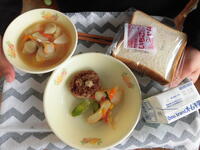 今日のメニューは、「ひよこ豆のスープ」「ハンバーグ」「アスパラソテー」です。