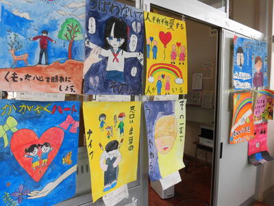 1年生教室では、上田先生の「がんばりしょう」が子供たちを迎えます。