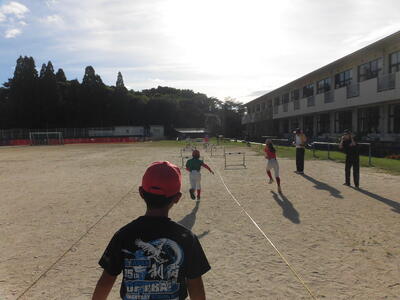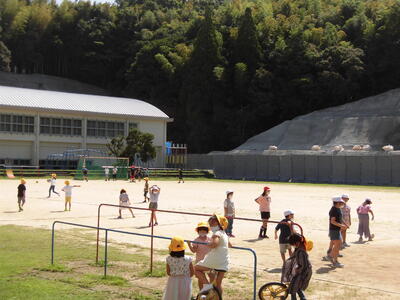 運動場では、ピカピカの天気の中、下学年の子供たちが元気に遊んでいます。