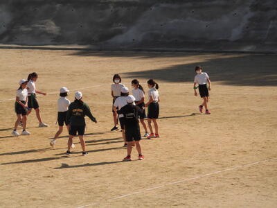 6年生が、声を掛け合って「タグラグビー」の練習をしています。