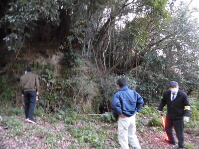 保護者の方から「巣穴らしきものがありますよ」と教えていただいたので、市役所の農林水産課の担当者にも現場に来ていただきました。