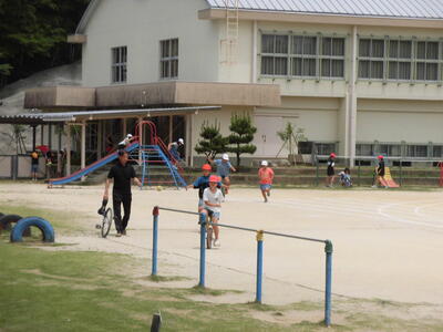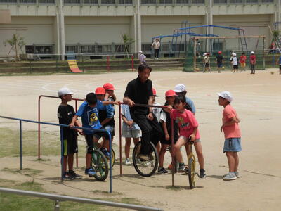 昼休み、3年生担任の原野先生が、子供たちと一緒に一輪車を楽しんでいました。